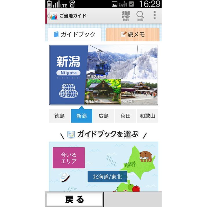 地図とあわせて活用したいのが、日本全国の観光情報やお店情報を満載したご当地ガイド。旅行の際に活用したいアプリだ