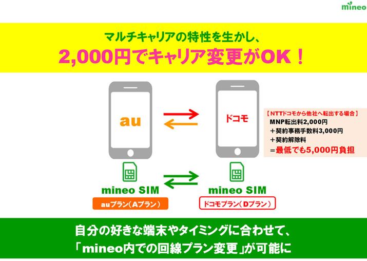 mineo内でNTTドコモとau間の回線を変更する場合の手続き費用はわずか2,000円。MNP費用や違約金などはないので、費用やタイミングなどの点で利便性が高い(画像はmineoより引用)