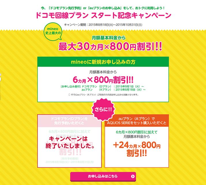 ドコモプランの提供開始を記念して、新規ユーザーを対象に、6か月間にわたり月額基本料金(1GBコース相当800円)が無料になるキャンペーンを実施中。現行のmineoユーザーについては、SIMカード変更手数料が1回分(2,000円)無料になる。キャンペーンは10月31日まで(画像はmineoより引用)