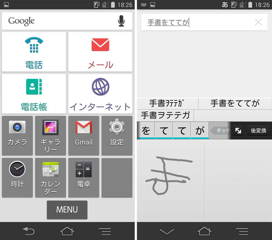 左が「シンプルホーム」。同社の「らくらくホン」に近いシンプルなホーム画面だ。手書き入力もサポートする(右)