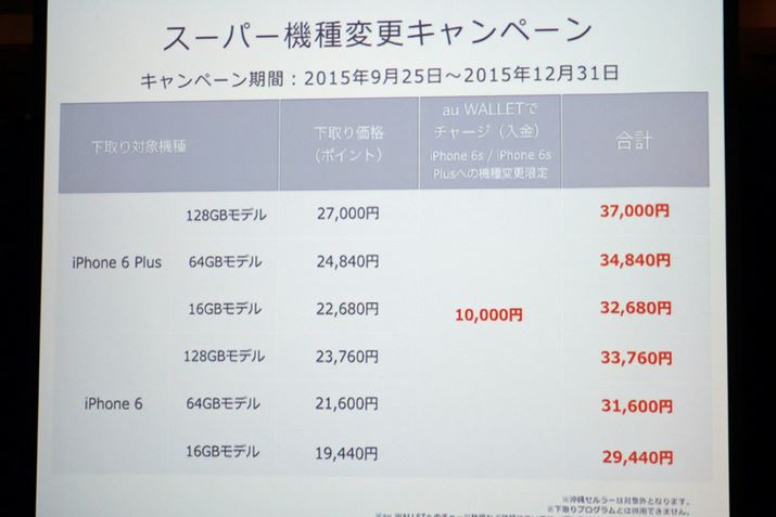 まず、iPhoneシリーズの端末下取り優遇キャンペーン「スーパー機種変更キャンペーン」を解説しよう。このキャンペーンの対象となるのは、iPhone 4S/5/5s/5c/6/6 Plusの各機種で、iPhone 6sおよびiPhone 6s Plusへ機種変更する際に、通常の下取り料金に加えて、「au WALLET」に10,000円分のポイントがチャージされるというもの。もっとも高価なiPhone 6 Plusの128GBモデルでは、下取り価格が27,000円に10,000円分のポイントが付与され、合計37,000円となる。キャンペーン期間は、2015年9月25日から12月31日まで。