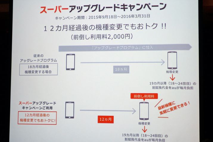 今回のスーパーアップグレードキャンペーンは、2015年9月18日〜2016年3月31日の期間にアップグレードプログラムへ加入したユーザーを対象に、2,000円を支払うことで、6か月前倒しにした12か月後から、このキャンペーンを利用できるというものだ。1年後に新機種へ買い替えることを想定している人にとっては、かなりおトクなキャンペーンと言えるだろう。(詳細はこちら)