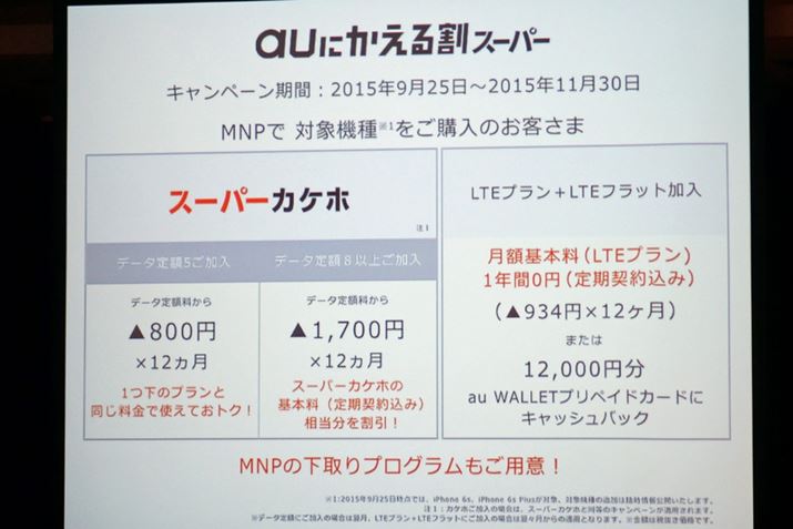 3つ目が、MNPでiPhone 6sおよびiPhone 6s Plusを契約した場合に、月額1,700円を最大1年間割り引く「auにかえる割スーパー」だ。このキャンペーンは、スーパーカケホ、カケホ、LTEプランが対象となっている。詳細はauのページを参照してほしい。
