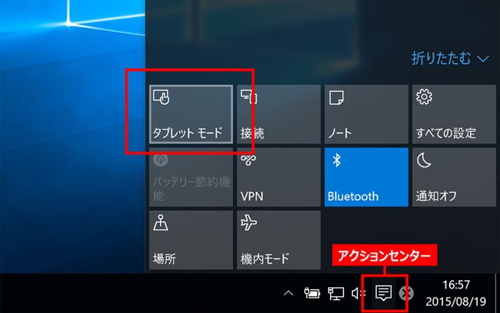 タブレットモードは、タスクバーのアクションセンターからオン・オフできる。2in1タイプのパソコンの中には、キーボードの脱着でタブレットモードと通常モードが切り替わるモデルもある
