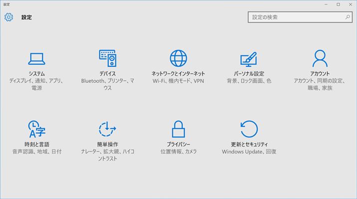 Wi-Fiの設定や画面解像度の調整、アカウントの管理などでよくお世話になる「設定」も便利だ。Windows 8ではチャームから「PC設定」が呼び出せたが、すべての設定を網羅しておらず、中途半端だったため、結局、「コントロールパネル」を使わなければならなかった。それに対してWindows 10の設定はシンプルなユーザーインターフェイスながら、必要なものがそろっている。アプリの削除、Windows Updateもここからできる。コントロールパネルも引き続き用意されているので、コントロールパネルに慣れているユーザーでも困ることはない。