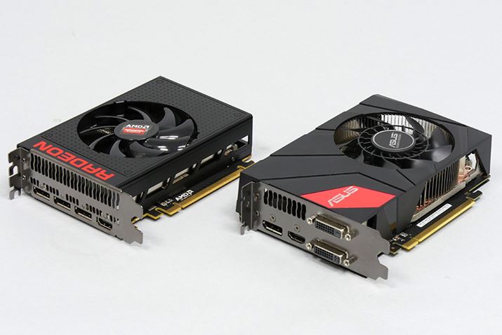 左:Radeon R9 Nanoビデオカード、右:ASUSのGeForce GTX 970ビデオカード「GTX970-DCMOC-4GD5」(長さ170mm)