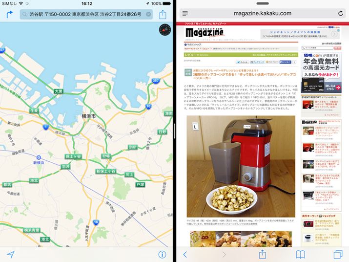 Slide Overで開いたアプリの境界線を左へスワイプして表示エリアを広げるとSplit Viewに切り替わり、2つのアプリをアクティブな状態で起動できる。横向きで使った場合、境界線は5:5か7:3の比率の位置で固定されるようだ。注意点は、Split Viewはどちらのアプリも対応していなければならないこと。先に開いたアプリが非対応のアプリの場合は境界線を動かせない