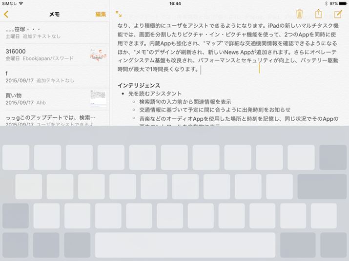 Slide Overで開いたアプリの表示エリアを広げると、画面を分割して、2つのアプリを同時に開いておけるSplit Viewとなる。どちらのアプリもグレーアウトせず、アクティブな状態で同時に開けるのがポイントだ。Safariを開きながら、メモアプリにメモを撮ったり、写真を表示しながらスケッチを描くといった使い方が想定される。マイクロソフトのOfficeアプリが対応するなど、仕事効率化のアプリの多くがこれらの機能に対応している。対応アプリはApp Storeにまとめられており、2015年9月29日時点では24のアプリが対応していた。