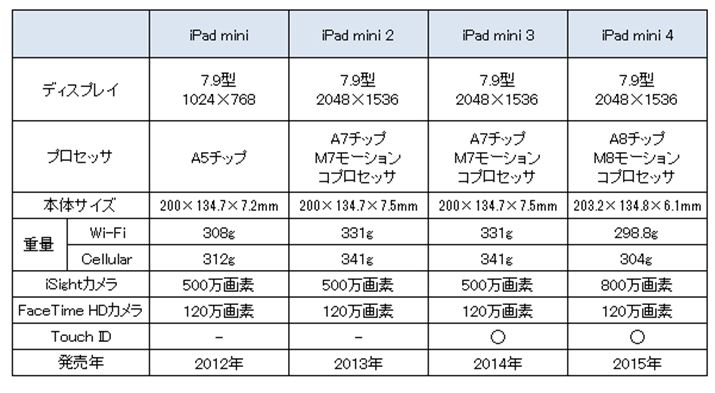 初代iPad miniは、iPadをコンパクトにしたモデルとして2012年に登場した。初代モデルは1024×768の7.9型ディスプレイを搭載していたが、翌年には2048×1536の高解像度な「Retinaディスプレイ」を採用した「iPad mini 2(Retinaディスプレイモデル)」が登場。第3世代の「iPad mini 3」では、ホームボタンに「Touch ID」が搭載され、指紋でロック解除などができるようになった。
