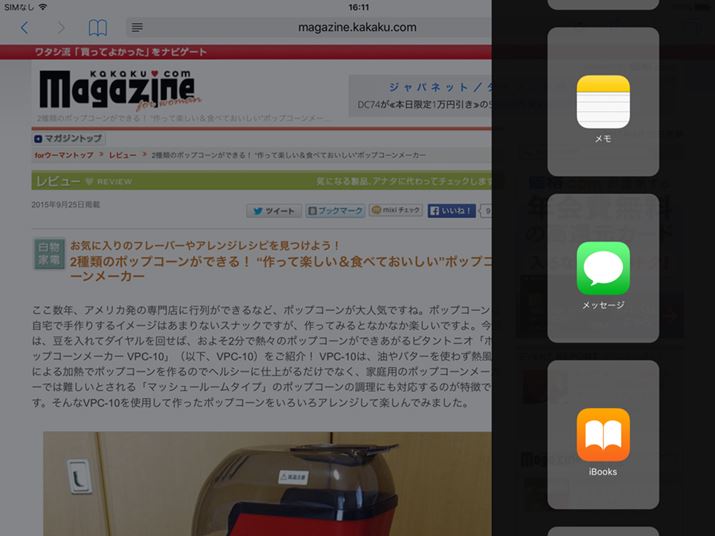画面の右端から左にスワイプすると使えるSlide Over。右の黒地の部分を上下にスワイプすると、Slide Overで表示するアプリを選べる