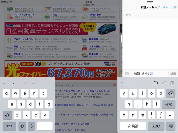 Slide Overでメッセージアプリを起動した状態。メール送信後に左から右へスワイプするか画面の左側をタップするとSafariへ戻れる。少しややこしいが、先に表示するアプリに制限はなく、「App Store」でも「設定」でも何でもいいが、Slide Overで2つ目に表示するるアプリには制限がある