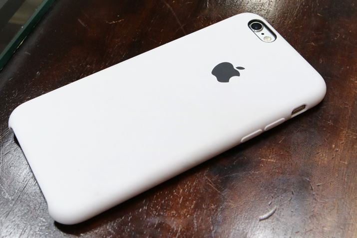 iPhone 6sとホワイトのシリコンケースの組み合わせ。よく見ると黒ではなくグレーのアップルマークと白のコントラストがカッコいい