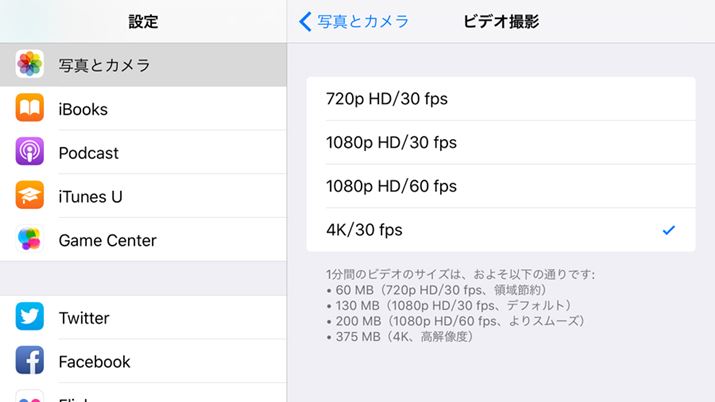 動画のサイズは設定から変更できる。動画のサイズの目安もいっしょに表示されており、1分間の4K動画は375MBとなる