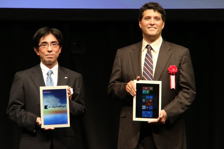 10月13日に開催された発表会では、東芝パーソナル&クライアントソリューション社の統括技師長の柏木和彦氏(左)がdynaPad N72の技術的な特徴をくわしく説明した。右は、ゲストとして登壇したマイクロソフトのエグゼクティブバイスプレジデントのテリー・マイヤーソン氏