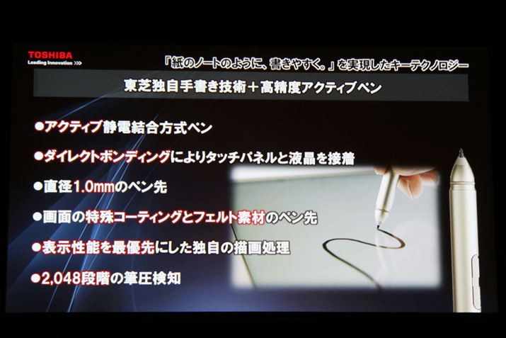 アクティブ静電結合方式のペンだけでなく、画面に特殊コーティングを施すことで、紙のような書き味を実現している。筆圧は2048段階