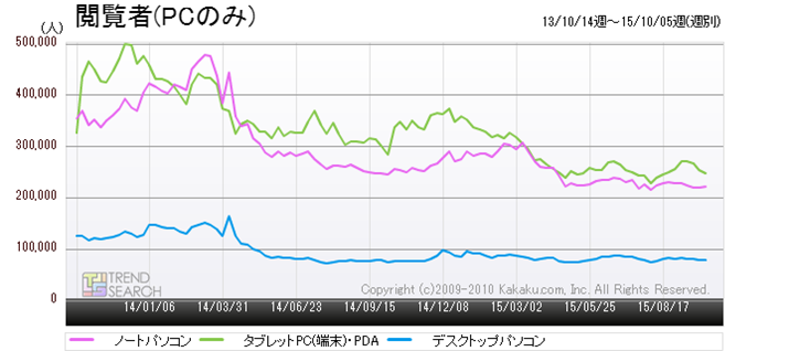 タブレット市場が今曲がり角に来ている。図1は、「価格.comトレンドサーチ」で見た、価格.comの「ノートパソコン」「デスクトップパソコン」「タブレットPC(端末)・PDA」という3カテゴリーのアクセス推移(過去2年間)を示したものだが、これを見るとわかるように、この2年間でどのカテゴリーもアクセスが減少している。この中では、タブレットの人気がノートパソコンを抜いて高い状態が続いてきたが、その勢いも2015年に入ったくらいからかなり弱まってきており、直近では再びノートパソコンと同等レベルにまで落ち込んでいることがわかる。