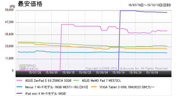 人気モデルの様子を見ると、その様子がより一層明らかとなる。図3は、同カテゴリーの人気5製品(2015年10月14日現在)のアクセス推移を示したものだが、1位はASUSの7.9インチAndroidタブレット「ZenPad S 8.0(32GB)」で、2位がGoogleの7インチAndroidタブレット「Nexus 7(16GB)」、3位が僅差でASUSの7インチAndroidタブレット「MeMO Pad 7(16GB)」、4位がソニーの10.1インチAndroidタブレット「Xperia Z4 Tablet(32GB)」で、5位がマウスコンピューターの8.9インチWindowsタブレット「WN891(32GB)」となっている。これを見るとわかる通り、上位はほぼ7〜8インチのAndroidタブレットで固められており、10インチクラスは少数。その下にはWindowsタブレットが続くという状況だ。しかも、ベスト5の中にアップルの「iPad」シリーズは1モデルも入っていない。