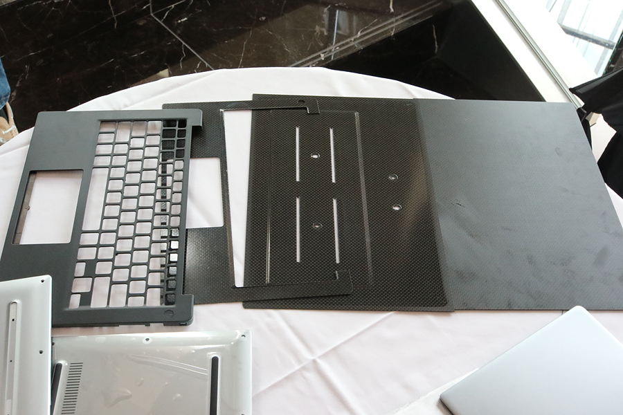 XPS 13でこだわったのはコンパクトさ。「他社は薄さを強調しがちだが、薄さだけでなく、幅と奥行きを削ることで、全体的な小型化を図っている」(タナカ氏)。13型ディスプレイを11型のノートパソコンのサイズに収めるためのキーとなるのが、日本メーカーと共同で作り上げた「インフィニティ・エッジ・スクリーン」だ。ベゼルを極限まで削ることで、幅と奥行きを抑えて、コンパクトなボディを実現している。また、アルミニウム合金とカーボンファイバーを使用するなど、素材にもとことんこだわっている。