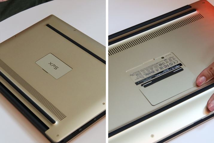 新色のゴールドモデルの底面。中央のXPSロゴは蓋になっており、開けると保証を受ける際に必要なサービスタグなどが記載されている。外観のデザインを崩さないためのこだわりだ