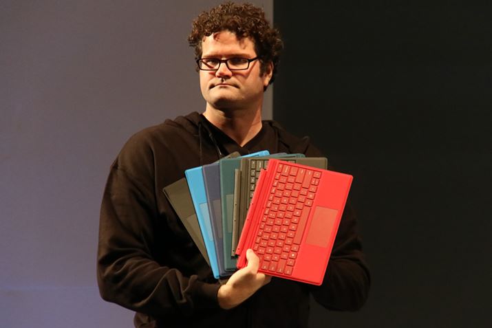 Surface Pro 4 タイプカバーを持つ米マイクロソフトのブライアン・ホール氏。同氏は、歴代のSurfaceシリーズの国内発表には必ず本社から駆けつける、Surfaceシリーズのキーマンだ
