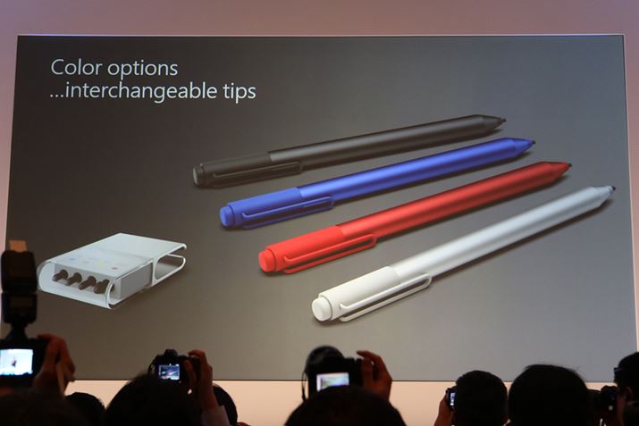 「Surfaceペン」は、筆圧が256段階から1024段階にアップし、ペン先の反対側が消しゴムとして使えるようになるなど、機能強化が図られている。Surface Pro 3では別売りだったが、Surface Pro 4では同梱されるようになる。また、Surfaceペンのトップボタンを長押しするとパーソナルアシスタント「Cortana」が起動する機能も盛り込まれた。このほか、別売りで「Surfaceペン先キット」(価格は税別で1,400円)を用意。4種類の太さが異なるペン先で、好みに応じて付け替えられる。別売りのSurfaceペン(同7,800円)には、Surfaceペン先キットが同梱される。