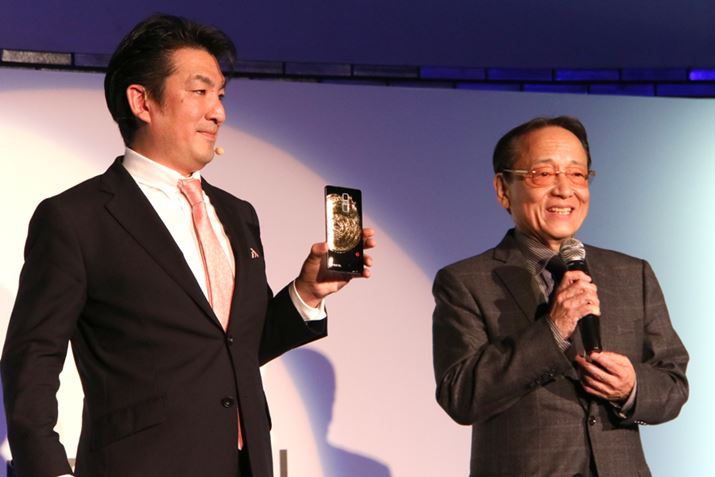 SAMURAI 極(KIWAMI)を持つ増田氏(左)と同社のプロダクト部 執行役員の佐々木隆文氏(右)。佐々木氏はソニー、電子機器受託生産 (EMS) 世界最大手のFoxconnを経て、役員として同社に加わった