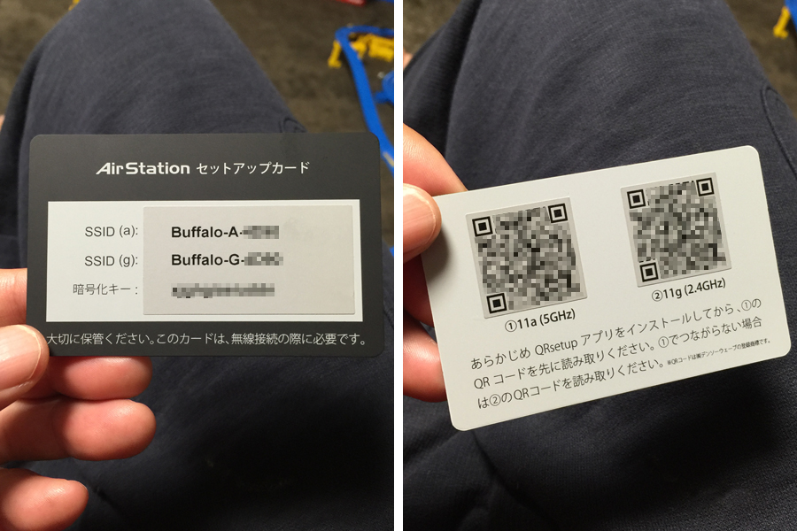 SSIDや暗号化キーが書かれたセットアップカードが付属する。設定時にカードを参照できるのは便利だ。設定が完了すれば、本体の裏側にセットしておける