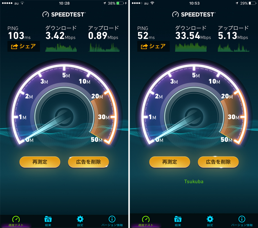 テストでは、IEEE802.11ac対応の「iPhone 6 Plus」(最大433Mbps)を使い、5GHz帯で接続した。家の中では、どこでも問題なく接続できる。速度の低下も見られない。筆者の自宅はマンションの3階なのだが、普段利用しているアンテナ内蔵式の無線LANルーターでは届かない1階でも電波が届いていた。肝心のトイレだが、通信速度を測定するアプリ「SPEEDTEST」で速度を測ったところ、下りが3.42Mbpsから33.54Mbpsへアップした。何度か試したが、結果は大きく変わず安定している。浴室でも同じく、速度アップを確認できた。これだけの速度が出ているので、YouTubeも快適に楽しめるし、LTEに切り替える必要もなさそうだ。