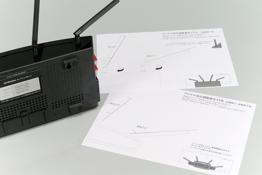 可動式アンテナのメリットは、家の形状に合わせて、アンテナの向きや角度を変えることで、より高速で安定した無線LAN環境を構築できること。同社では、「利用環境別アンテナ設置ガイド」をPDFファイルで公開している(下写真)。推奨例として、「同じ階の隅まで電波を届ける」「異なる階にも電波を届ける(家の中央付近に設置する)」「異なる階にも電波を届ける(家の隅に設置したり壁掛けする)」「本製品を中継器として使用する場合」の4つがある。なお、今回は、「同じ階の隅まで電波を届ける」の設定で試した。