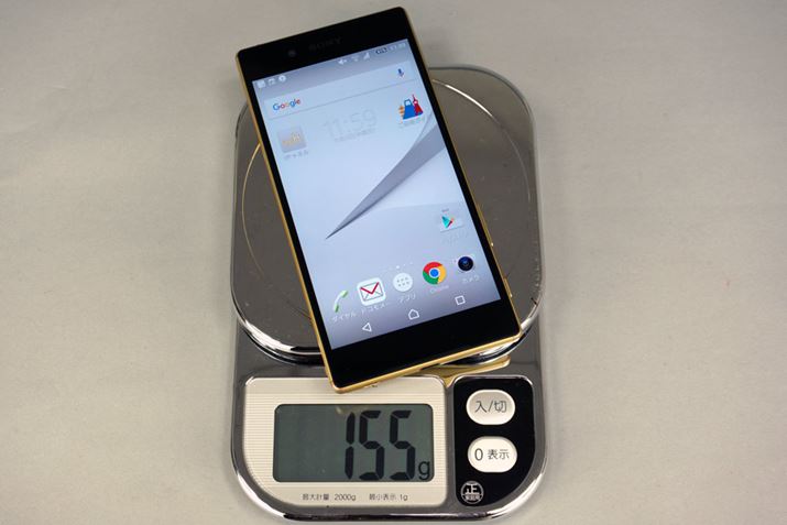 重量はカタログ値で154g。SIMカードやmicroSDメモリーカードを装着した状態で重量を測定したところ155gだった