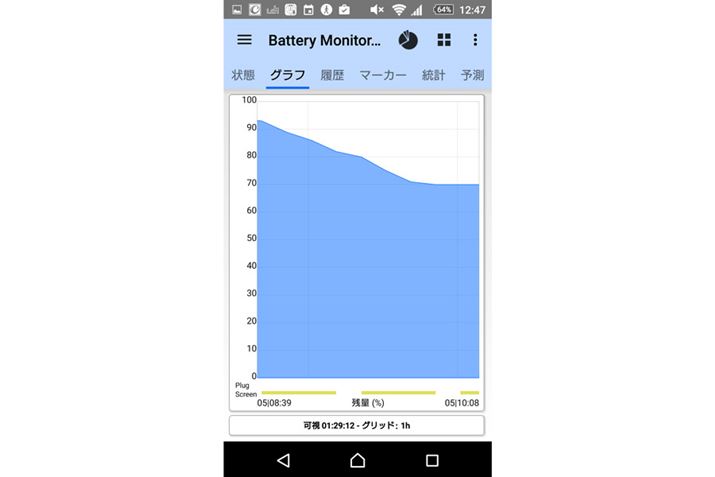 約1時間30分ほどWebページの閲覧を中心に断続的に使い続けた際のバッテリー消費のグラフ。93%→70%という23%消費された。筆者の常用しているスマホが35%程度の消費なので、悪い値ではない