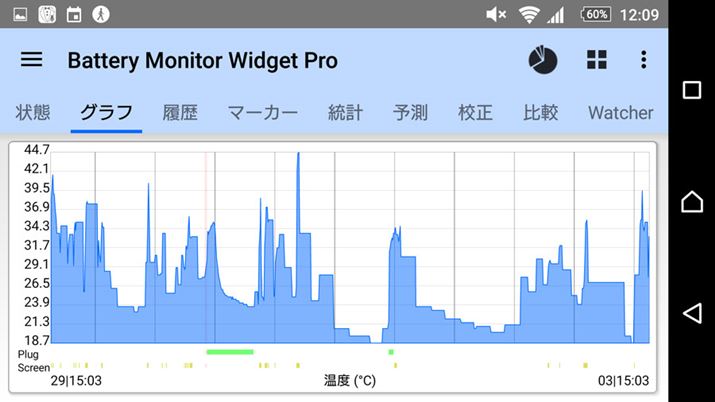 検証中のCPUの発熱をグラフ化したもの。最高で44.7度を記録したが、これは処理負荷の高いARエフェクトを長時間使用したときのもの。特筆するほどの高熱が続くことはなかった