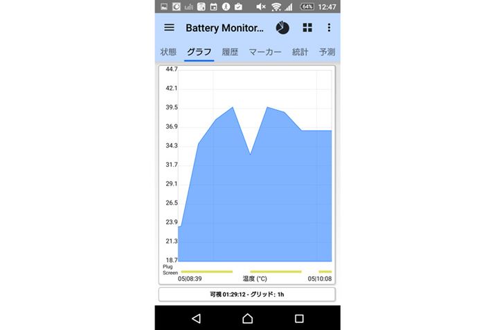 検証期間中の発熱をグラフ化したものを見ると、「ARエフェクト」を使い続けた際に44.7度を記録したが、Webページを閲覧する程度なら温度上昇は比較的ゆっくりしている。