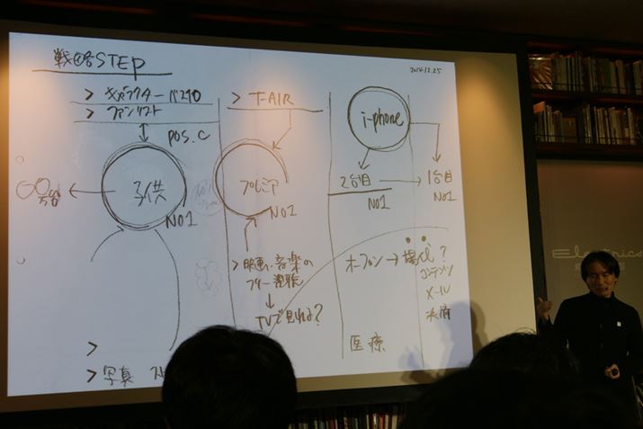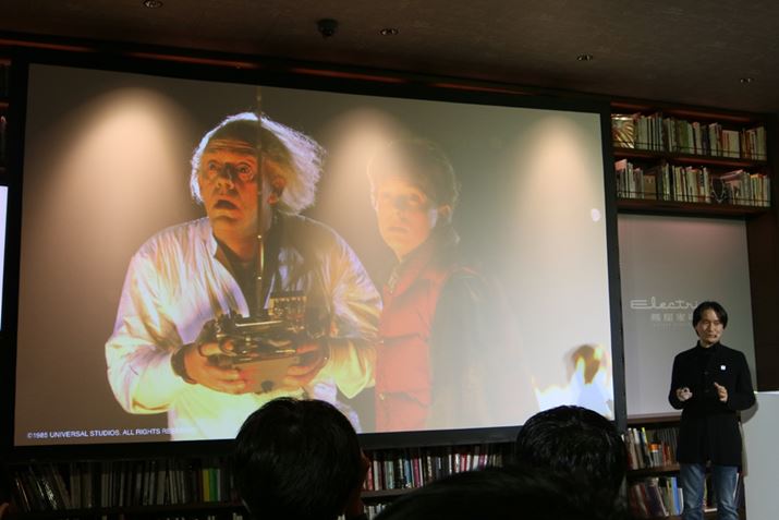 プレゼンテーションをする石田社長。発表会は二子玉川 蔦屋家電で開催された。映画「バック・トゥ・ザ・フューチャー」(BTTF)のワンシーンを用いるなど、趣向を凝らしたプレゼンテーションが印象的だった。BTTFではタブレットやテレビ電話などが登場したが、スマートフォンは登場しなかったという
