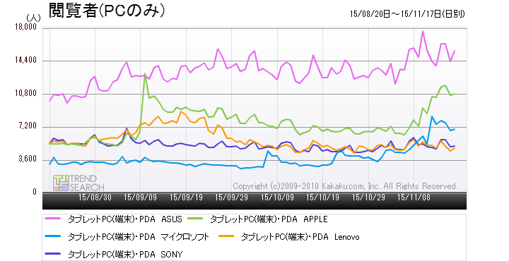 実は、価格.comの「タブレットPC(端末)・PDA 」カテゴリーにおけるASUSの人気はかなり根強い。図10は、「タブレットPC(端末)・PDA 」カテゴリーにおけるメーカー別アクセス推移だが、他のメーカーをかなり突き放して、ASUSの人気が突出して続いていることがわかる。2位は「iPad」を擁するアップル、3位は「Surface」を擁するマイクロソフトとなっているが、マイクロソフトはつい先頃までは4位という状況だった。11月に発売された「Surface Pro 4」によって、その人気が高まっていると言えそうだが、それにしても、WindowsタブレットもAndroidタブレットも両方手がけ、破格のプライスのモデルを多数市場に投入してくるASUSの人気は当面揺らぎそうにない。