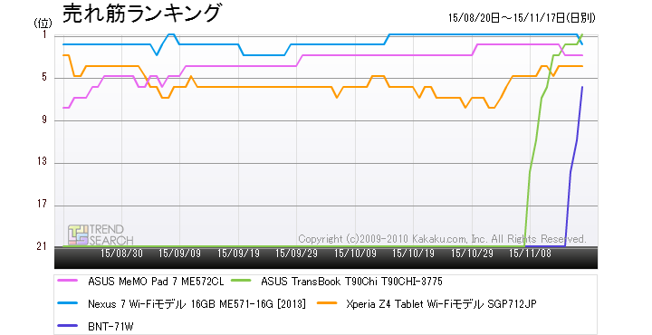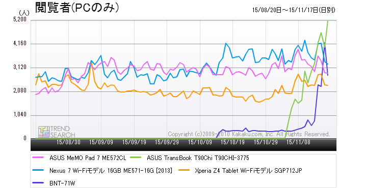 図4は、「タブレットPC(端末)・PDA 」カテゴリーにおける人気製品5モデルのアクセス推移を示したものだが、これを見ると、従来から人気のあったGoogle「Nexus 7(2013年モデル)」、ASUS「MeMO Pad 7」、ソニー「Xperia Z4 Tablet」に加えて、本機ASUS「TransBook T90Chi」と、BLUEDOT「BNT-71W」の人気が急激に高まってきているのがわかる。この中で、Windowsタブレットは、「TransBook T90Chi」のみとなる。なお、現在売れ筋ランキング5位のBLUEDOT「BNT-71W」は、Android 5.1を搭載した7型タブレットで、やはり7,980円という破格のプライスが話題を呼んでいる製品だ。このように、この11月は、絶対的なコストパフォーマンスを実現した2つのタブレットが、大きな人気を呼んでいる展開となっている。