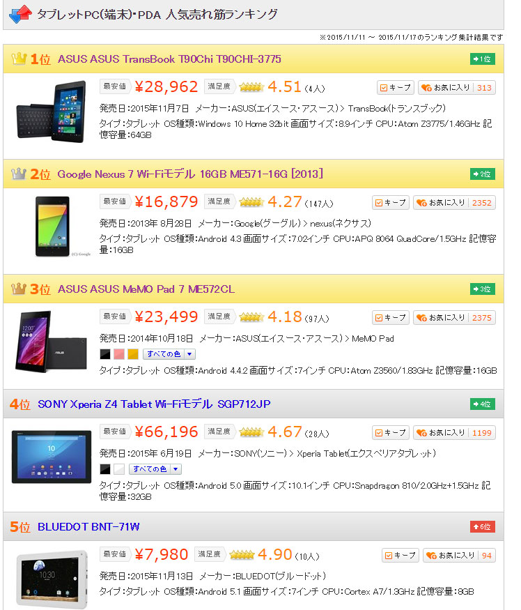 図1:「タブレットPC(端末)・PDA 」カテゴリーにおける売れ筋ランキング(2015年11月18日現在)