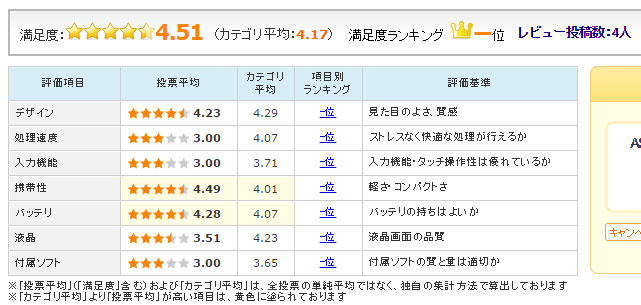 本機「TransBook T90Chi」を購入した人のユーザーレビューを見ると、総合満足度は4.51(4名が評価)となっており、そこそこ満足度は高い。ただし、その内訳を見ると、かなり極端な評価結果になっており、デザイン、携帯性、バッテリの項目は評価が高いが、処理速度、入力機能、液晶、付属ソフトの各項目では、平均を下回る低めの評価となっている(図9)。