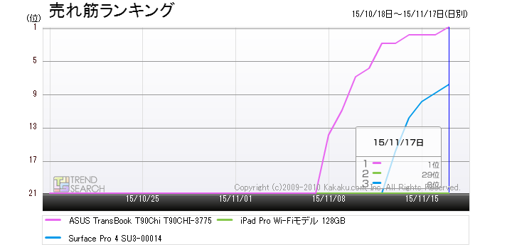 なお、本機「TransBook T90Chi」と、マイクロソフト「Surface Pro 4(128GBモデル)」、アップルの「iPad Pro(128GBモデル)」の3機種のアクセス推移を比べると、図6のようになる。マイクロソフト「Surface Pro 4」とアップルの「iPad Pro」の注目度は同じくらいだが、すでに注目度はピーク入りしつつあり、今後伸びるかどうかはわからない。しかしながら、「TransBook T90Chi」のほうはいまだアクセスが伸びており、この人気はしばらく続きそうだ。なお、この3機種の注目ランキングおよび売れ筋ランキングの順位を見ると、注目ランキングには3機種ともベスト5に入っているものの、売れ筋ランキングでは、本機が1位、「Surface Pro 4」が8位、「iPad Pro」が29位と、大きな隔たりがある(図7、図8)。もっとも「iPad Pro」の場合、一般のネット通販での流通がほとんどないため、正しい比較にはならないことは付け加えておこう。