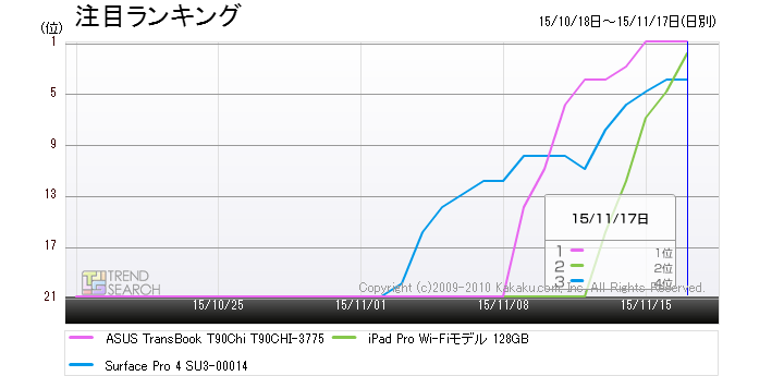 図7:「TransBook T90Chi」「Surface Pro 4」「iPad Pro」の3機種の注目ランキング推移(過去3か月)