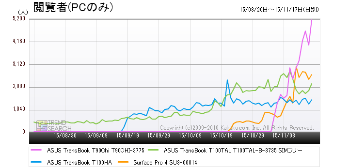 では、話をWindowsタブレットだけに絞って見るとどうなるだろうか。図5は、Windowsタブレットの人気モデル4製品のアクセス推移を示したものだが、これを見ても、「TransBook T90Chi」の人気の上がり方が群を抜いているのがわかるだろう。Windows 10搭載タブレットの本命モデルであるマイクロソフトの「Surface Pro 4(128GBモデル)」もそこそこ人気を高めてきているが、それに比べても倍近い人気である。なお、Windowsタブレットはここへ来て軒並みアクセスが上昇傾向にあるが、これは従来のWindows 8.1搭載タブレットを購入して、Windows 10に無償アップグレードしようという人が増えていることを示唆している。