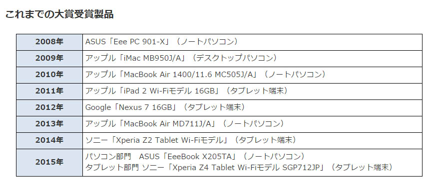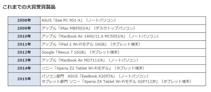 しかしながら、このASUS「Eee PC 901-X」を最後に、ネットブック、さらにはWindowsパソコンの人気は徐々に下がっていき、プロダクト大賞を取るということも久しくなくなってしまう。そしてこれと入れ替わるように、人気を獲得していったのが、アップルの「iMac」「iBook」「MacBook」「iPad」といった製品達だった。これらアップルのパソコンやタブレット製品は、2009年(iMac MB950J/A)、2010年(MacBook Air 1400/11.6 MC505J/A)、2011年(iPad 2 Wi-Fiモデル 16GB)の3年連続でプロダクト大賞に選ばれ、さらには、1年挟んだ2013年にも「MacBook Air MD711J/A」で大賞を受賞している。