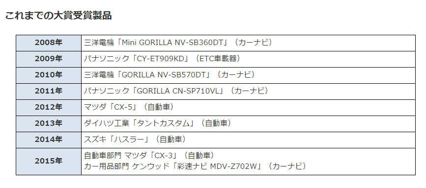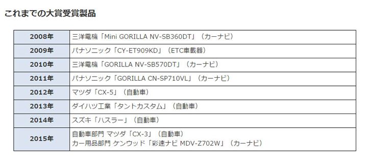 こうした歴史があるため、2008年から2011年までの前期は、プロダクト大賞受賞製品はカー用品のみとなる。なかでもカーナビ製品の人気が高く、4年中3年はカーナビ製品の受賞となった。異色なのは、2009年のETC車載器、パナソニック「CY-ET909KD」の大賞受賞であるが、この年は、民主党政権による「高速週末1000円法案」によるETC特需があったため、ETC車載器の需要自体がグンと高まったというのがその大きな理由だ。