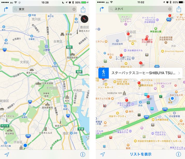 現在地と、スタバ検索結果。マップはかなり使えるぞ。もちろん、現在地の地図が表示され、住所や店名での検索も可能(画像は「iOS 9」のマップ)
