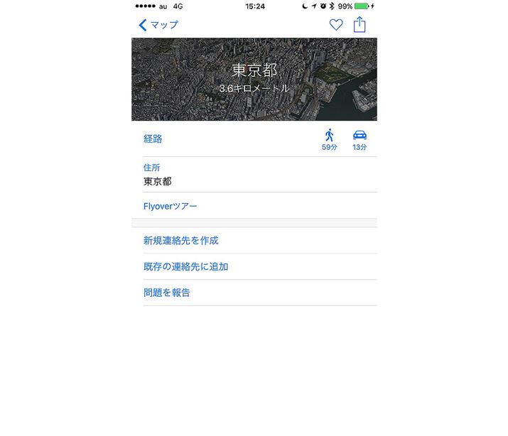 Flyover ツアーを利用するには、まずは都市名で検索。「○○を3D Flyover表示」と表示されればツアーが可能。「出発」をタップして、遊覧を楽しもう