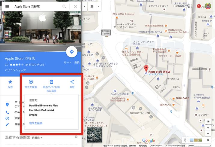 ほかにもPCのブラウザー版「Google マップ」との連携機能も用意されていて、PCで検索した位置情報を、登録してあるiPhoneやスマホ、iPadやタブレット端末に送ることができるぞ。
