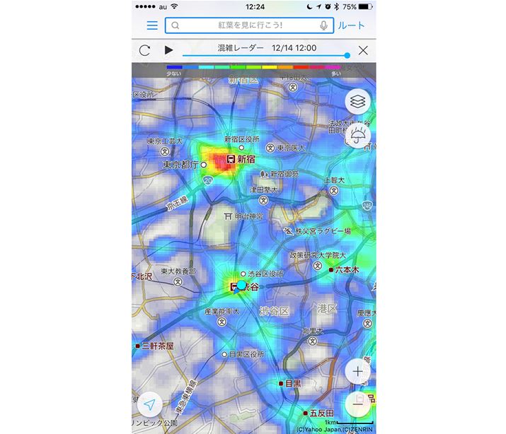 「混雑レーダー」では、人々の混雑具合を地図上に表示。画面上部のスクロールバーで、過去3時間までの様子も見ることができる