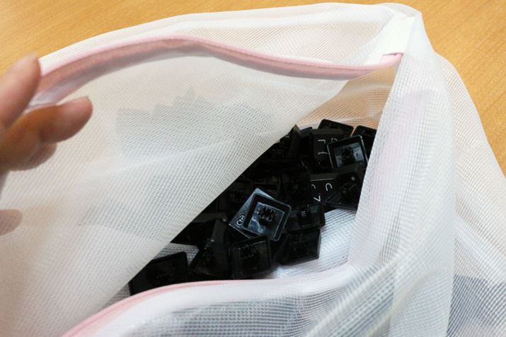 キートップをすべて外したら、付着したほこりや皮脂を落とすため水洗いをする。ポイントは、紛失防止のために洗濯用ネットに入れて洗うことと、水洗い後によく乾かすことだ。