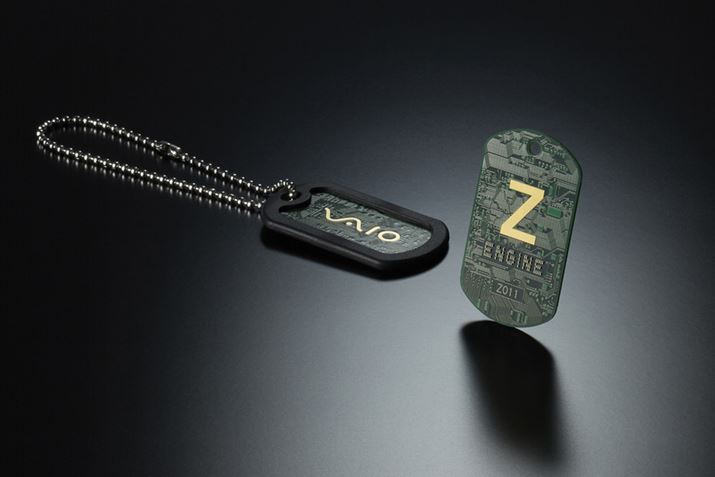 特別オプションとして、直販モデルでCore i7+メモリー16GB構成を選んだ場合のみに選べる勝色ダブルアルマイト仕様を用意。天板のVAIOロゴが勝色に光るというものだ。また、台数限定でキートップから一切の刻印を取り除いた無刻印キーボードモデルも用意する。US配列しか選べない、ストイックすぎるモデルだ。さらに、初回購入特典で、「Z ENGINE基板アクセサリー」をプレゼントする。VAIO Zで実際に使用された回路パターンの一部をドックタグ仕様にしたもので、「ENGINE」の文字に極小チップコンデンサを使ったこだわりのアクセサリーだ。