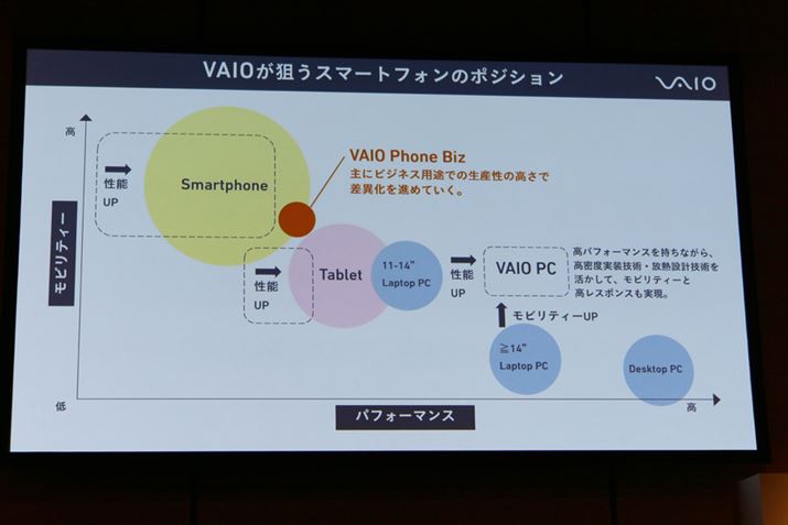 VAIO Phone Bizが狙うポジショニング。パフォーマンスにこだわるVAIOらしく、性能を重視したモデルに位置付けている